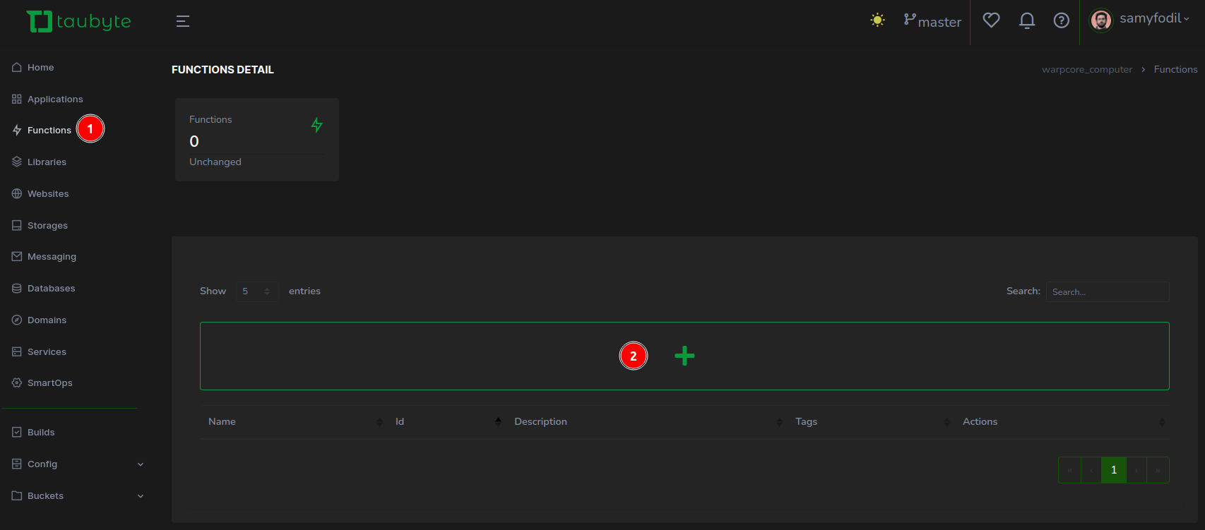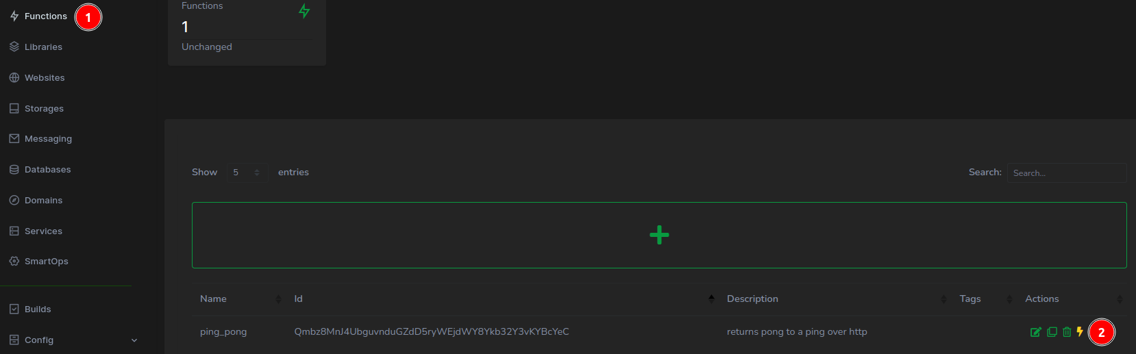 With the modal closed, navigate to the left side menu, (1) click on Functions, then (2) hit the “+” button to concoct a new function.