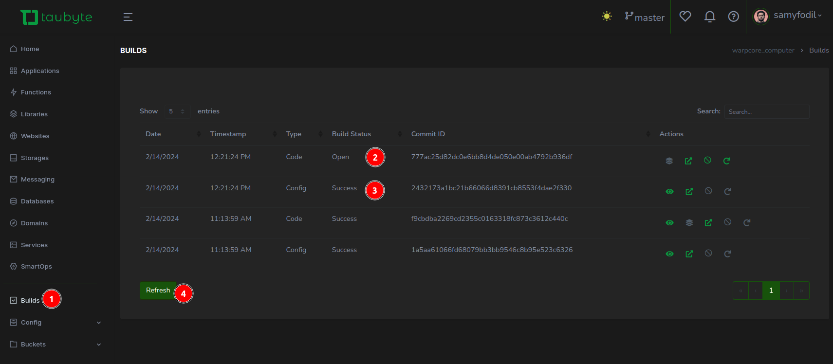 After successfully pushing your changes, these are mirrored in your GitHub repositories. This step initiates CI/CD processes, crucial for deploying and testing your configurations and code. In the Taubyte console, (1) navigate to the Builds section to monitor the progress. Here, you’ll observe two pivotal jobs: (2) one for the configuration build and (3) another for compiling the code. Configuration builds conclude swiftly, whereas code compilation, especially for languages like Rust, will takes some time.