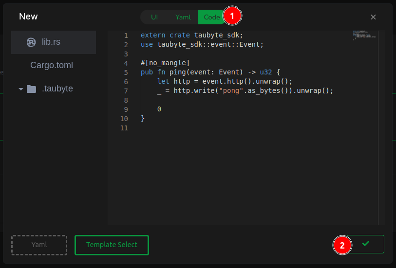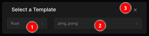 In the subsequent modal, positioned centrally at the top, (1) pick a programming language—Rust, in this instance, (2) select a template—opting for ping pong, and (3) dismiss the modal.