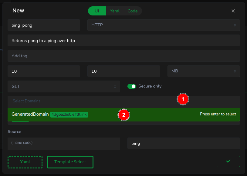 Back in the function creation modal, nearly all fields should be prefilled except for the domain. (1) Click on Select Domain, then (2) choose GeneratedDomain, automatically provisioning a domain resource.