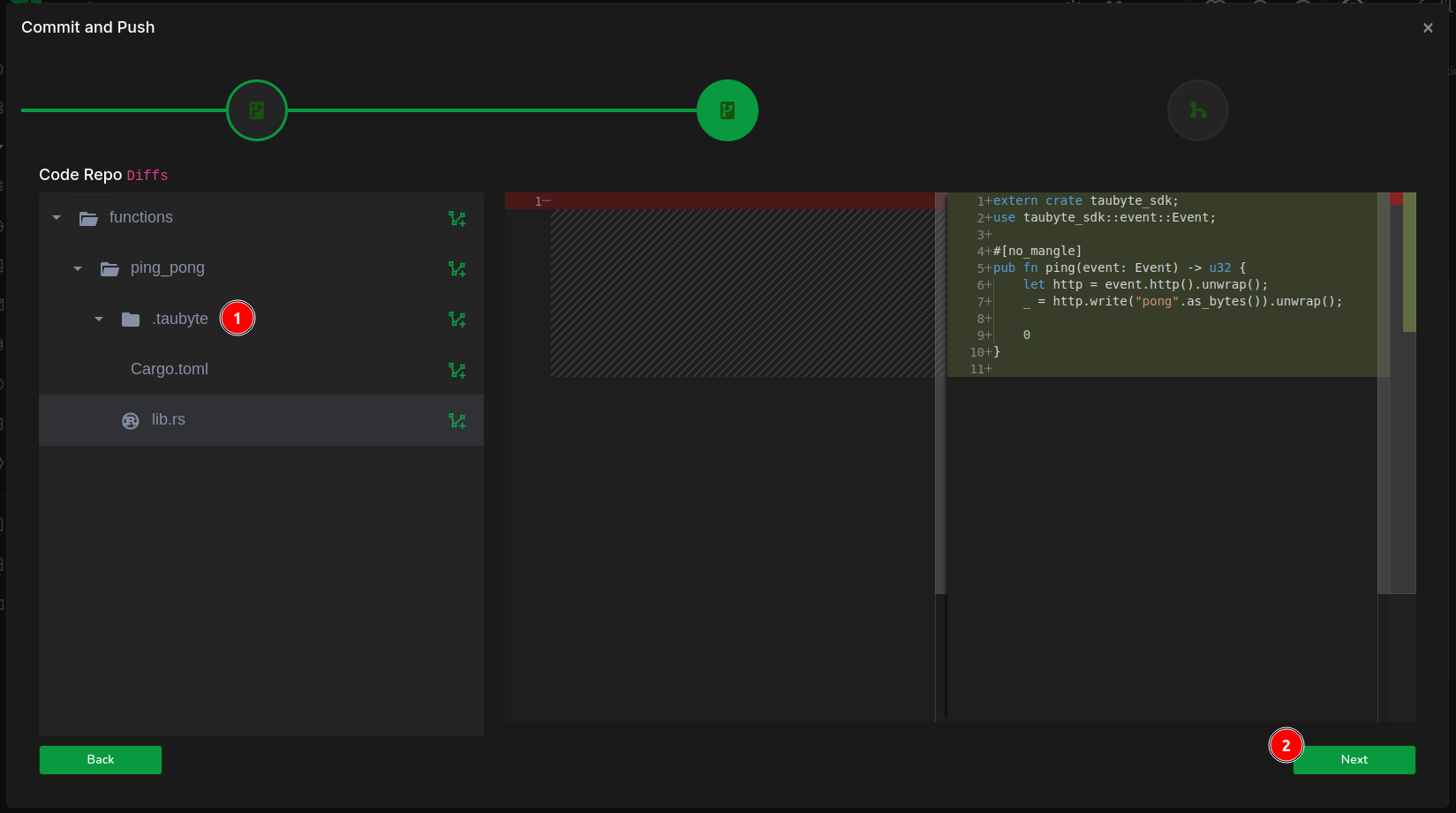 The following screen showcases code changes. By selecting lib.rs, you can inspect your code. Once reviewed, (2) move forward.