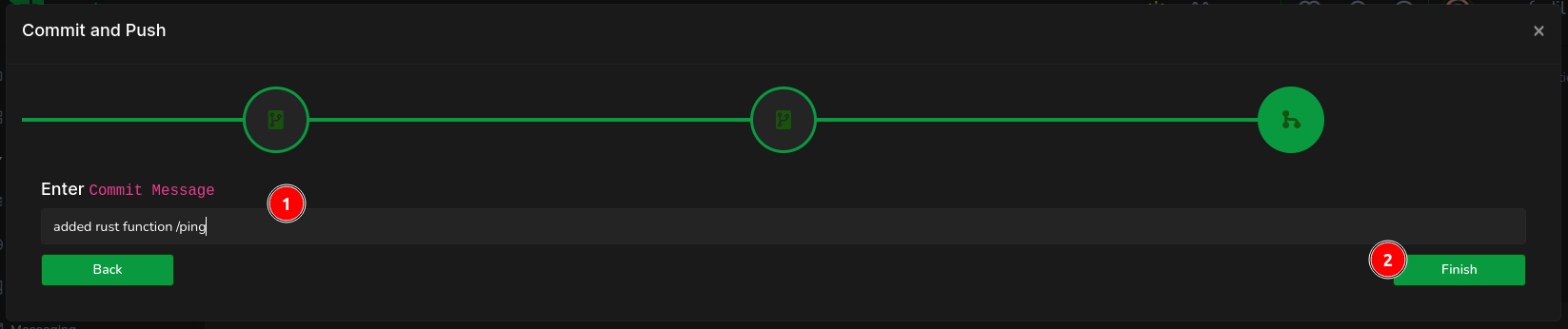 Finally, (1) encapsulate your efforts in a commit message, then (2) click on Finish to complete the process.