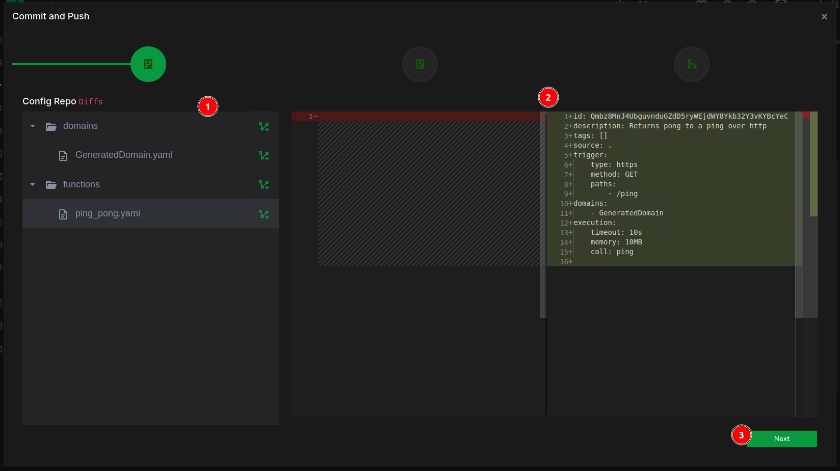 The initial screen presents the diff in the configuration repository. (1) Examine the ping_pong.yaml for function configuration details, then (2) proceed to the next step.