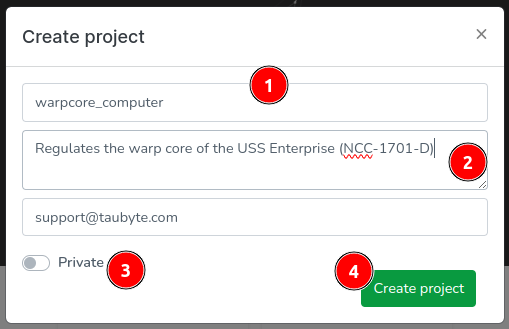 In the modal that appears, you’re prompted to define your project: (1) Enter the project’s name, (2) provide a description, (3) decide whether the repositories related to this project should be private, and finally, (4) click on “Create project” to seal the deal.