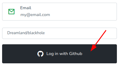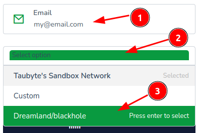 (1) Type your email, then (2) click on the network selection input, and finally (3) click on Dreamland/blackhole.