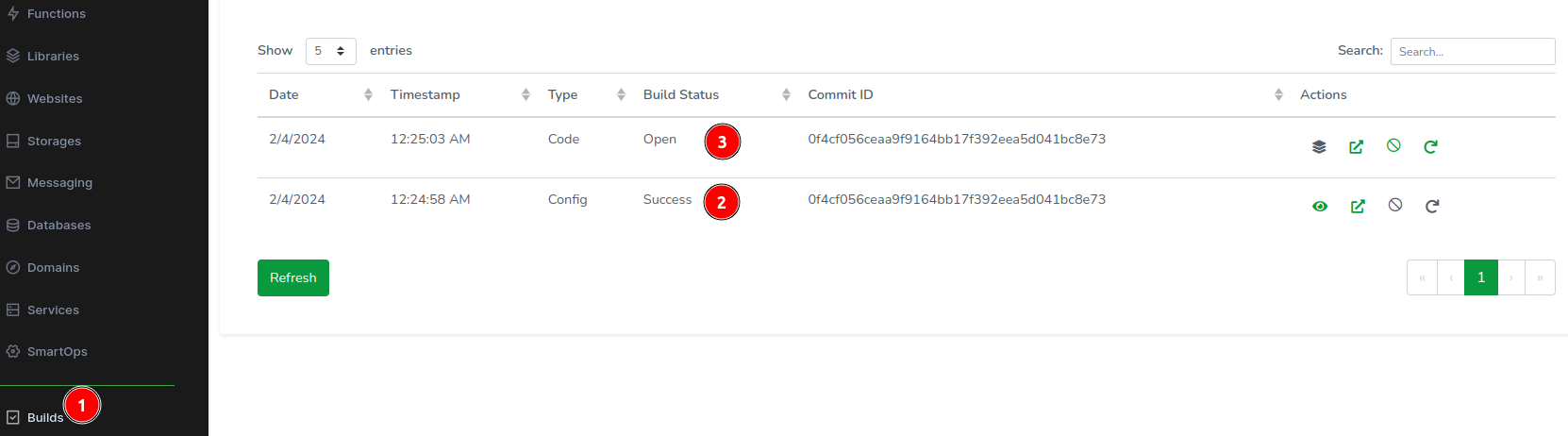 After a few seconds, the build should complete. Click on Refresh if it seems delayed. Then, click on the stack icon to view the ping_pong function.