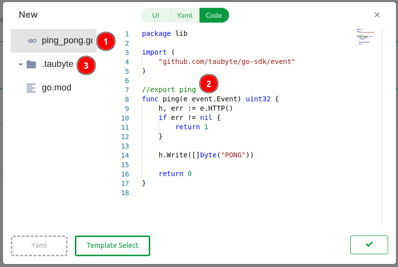 In the editor, you will observe (1) the usual Go files including go.mod, (2) the code for our handler function ping, and (3) a .taubyte folder defining how the function is built.