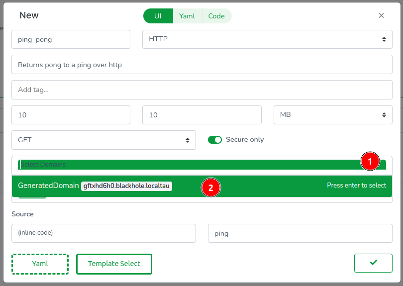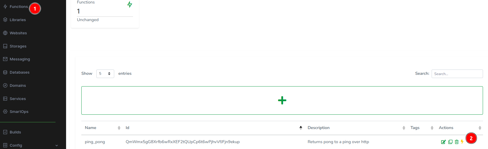 If you’ve added the generated domain to your /etc/hosts, you can also use the Web Console to hit the function’s endpoint: (1) In the sidebar, click on Functions, then (2) click on the thunder icon.