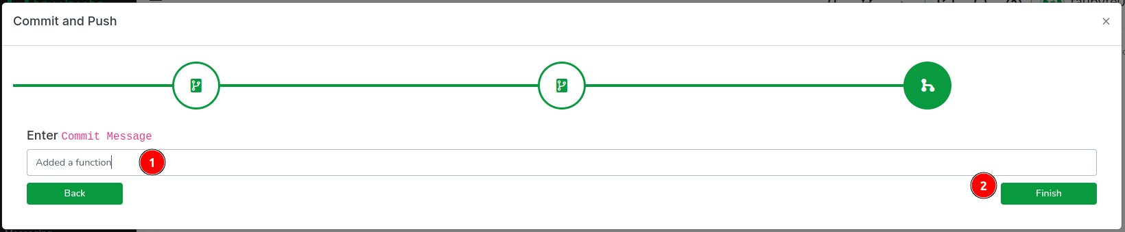 Everything done so far is confined to the virtual filesystem in your browser. To apply these changes, we need to push them. Find the green button at the bottom right of the screen and click on it.
