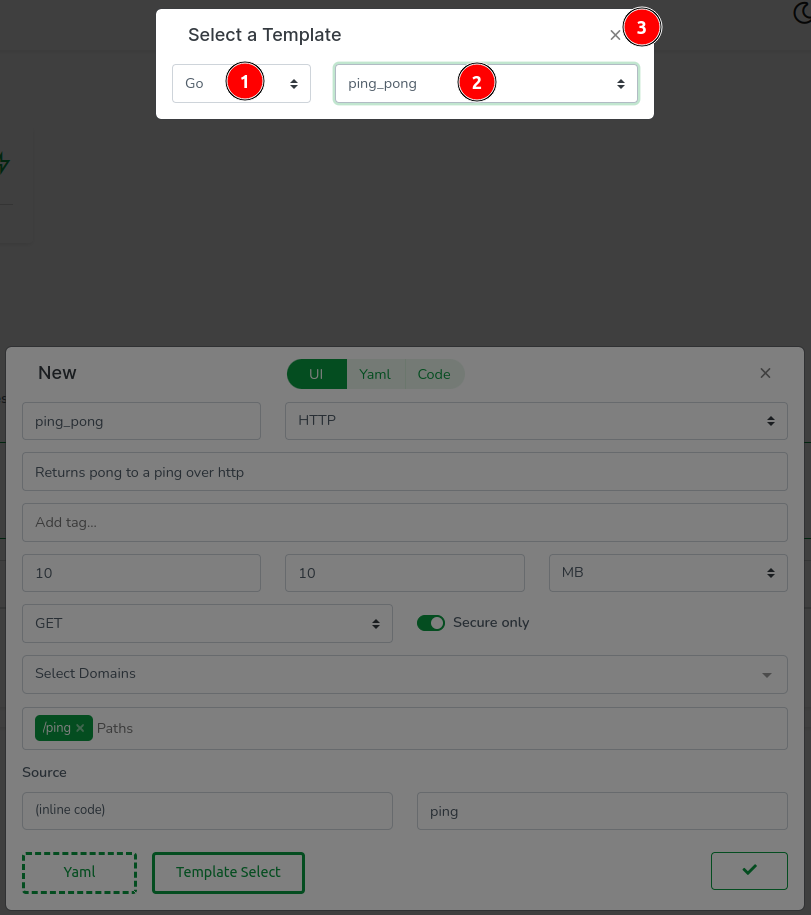 This action opens another modal at the top where you can select a template. Although you can choose Go, Rust, or AssemblyScript at the time of writing this article, we’ll keep it simple and go for Go! (pun intended). So: (1) select Go, (2) select ping_pong, and finally (3) close the modal.