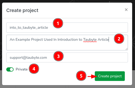 Enter a project name, a description, toggle private (unless you want the project repositories to be public), then click on Create Project.