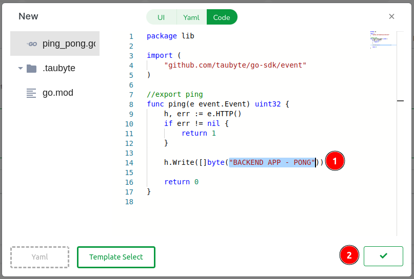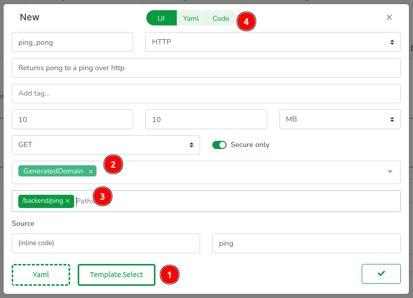 Let's create a function in our application. In the function tab, click on the + button. Then select the ping_pong template, ake sure we're using generated domain, and use /backend/ping as the path.