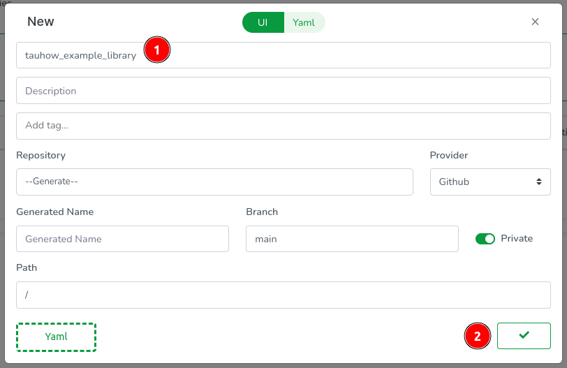 Note: use your own repository id and fullname. If you didn't save them you can Navigate to the library, click on it then switch to YAML to find them. Another way if to just open the config repository and find them in libraries/tauhow_example_library.yaml.