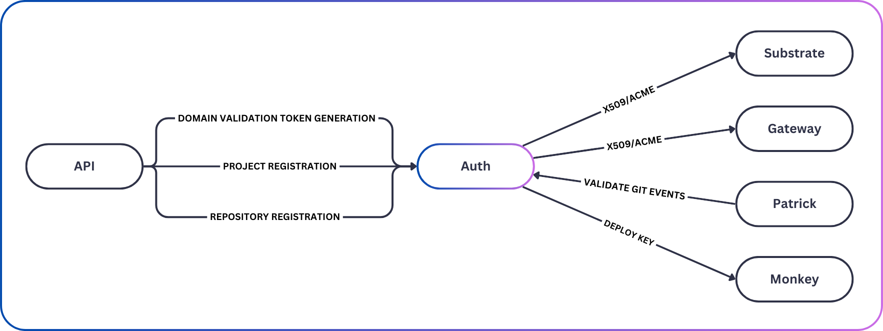 The Auth service is the cornerstone of security, managing authentication, authorization, and secrets across the platform. It integrates with Git providers to map repository access to projects and securely stores credentials for other services.