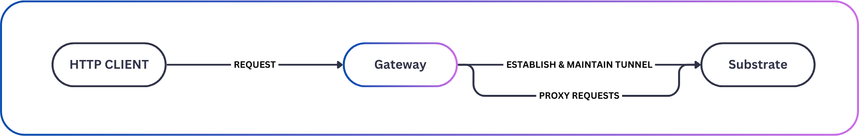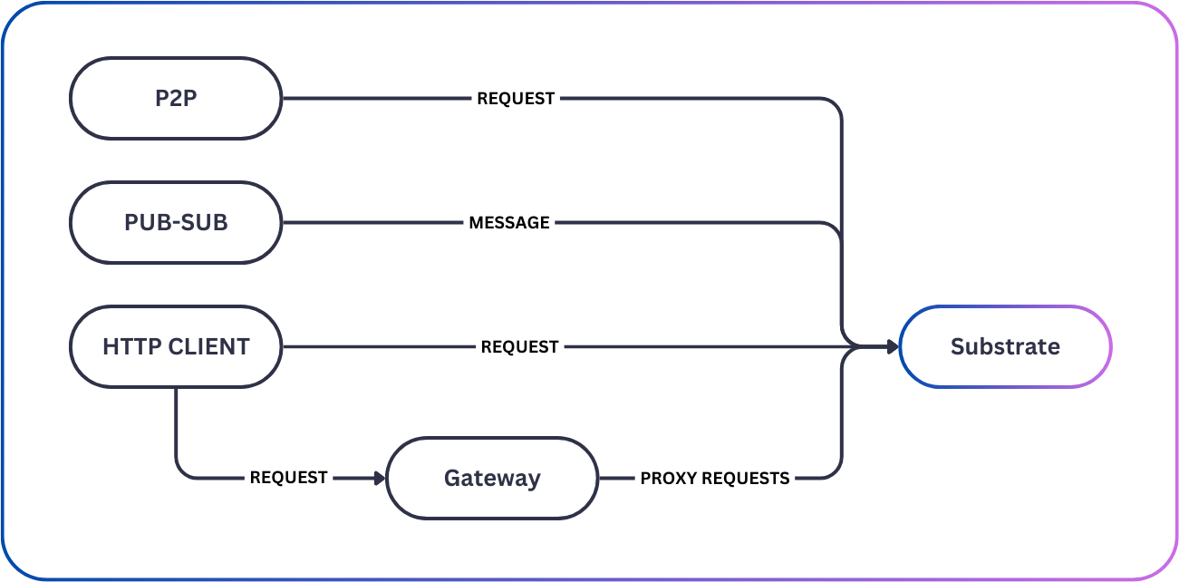 The Gateway service acts as the platform's load balancer. It identifies nodes running the substrate service and maintains multiplexed connections with healthy nodes.