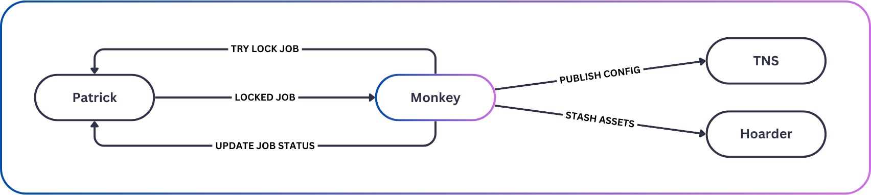Once a job is locked by a Monkey instance, it executes the build, sends status and logs to Patrick, publishes configuration to TNS, and marks assets for replication by the hoarder service.