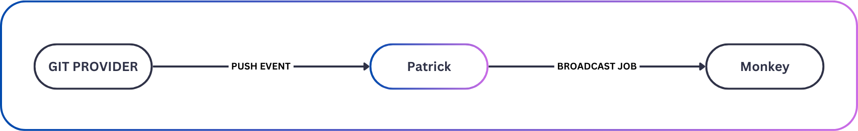 Patrick orchestrates CI/CD jobs, listening for events from Git providers over HTTPS. It validates requests, creates build jobs with appropriate attributes, and manages job lifecycles.
