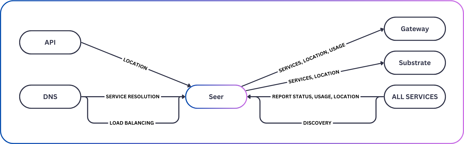Seer functions as the network's directory, maintaining a comprehensive record of all nodes. It stores data on services, usage, and metadata, sharing this information internally with services like gateway and externally via DNS.
